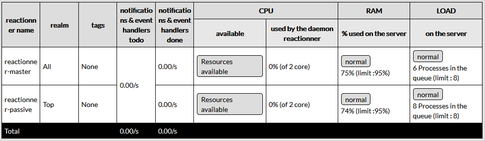 Enfin les deux dernières colonnes affichent les informations CPU des Reactionners, de la même manière que pour les Pollers.