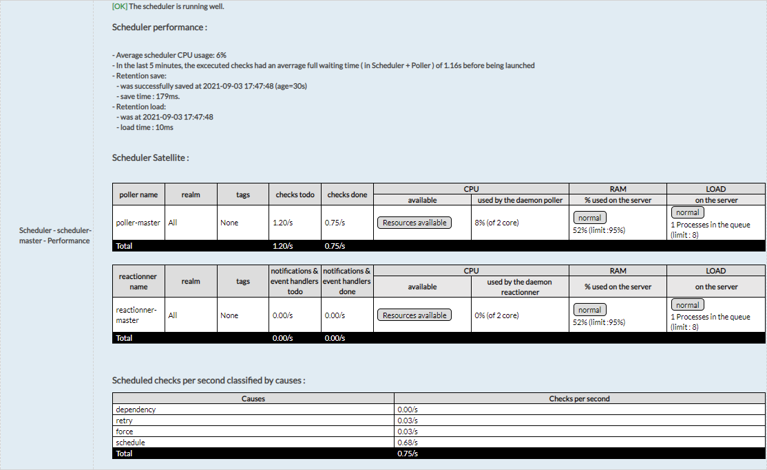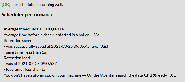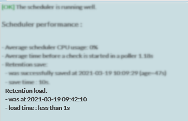 Si votre Scheduler est en bon état de fonctionnement, c'est-à-dire qu'il permet d'ordonnancer correctement tous les checks et de recevoir les résultats de ces checks en temps et en heure, alors le statut du retour du check "Scheduler - Running Well" est OK.