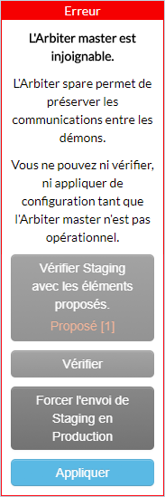 Votre Arbiter maître n'est plus joignable. On note que même si un Arbiter Spare est présent et fonctionnel, le bon fonctionnement de l'Arbiter maître est requis pour l'application d'une nouvelle configuration. Cependant, si l'Arbiter est à l'arrêt à cause d'un problème de configuration qui peut être résolu via votre UI de configuration, un bouton peut vous permettre de forcer l'envoi de Staging vers la Production. Par exemple, si des hôtes utilisent un Poller Tag et que soudainement ce Poller n'est plus défini dans votre architecture Shinken, alors l'Arbiter ne pourra pas démarrer. Vous pourrez changer le paramétrage de ces hôtes (ou les désactiver) via l'UI de configuration puis utiliser le bouton "Forcer l'envoi de Staging en Production". Il vous suffira alors de démarrer l'Arbiter manuellement et votre architecture sera à nouveau opérationnelle. |