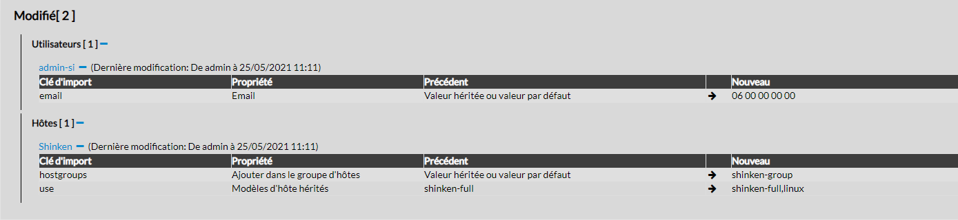 Les éléments modifiés sont affichés dans un tableau présentant les champs qui ont été modifiés, avec l'ancienne valeur, et la nouvelle.