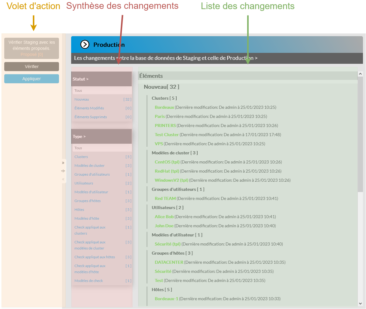 Cette zone contient une synthèse des changements à appliquer en Production. Elle permet aussi de filtrer la liste des changements.