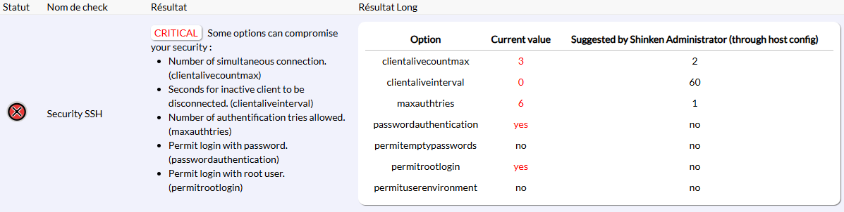 Dans l'optique de proposer une sécurité stricte, nos valeurs par défaut ont été choisies pour une installation basique d'un serveur linux, nous vous conseillons fortement de les modifier pour les adapter à la sécurité que vous souhaitez fixer sur votre/vos serveur(s). Comme expliqué précédemment, ces données sont utilisées uniquement si la donnée SSH_SECURITY_WARN est à True. |