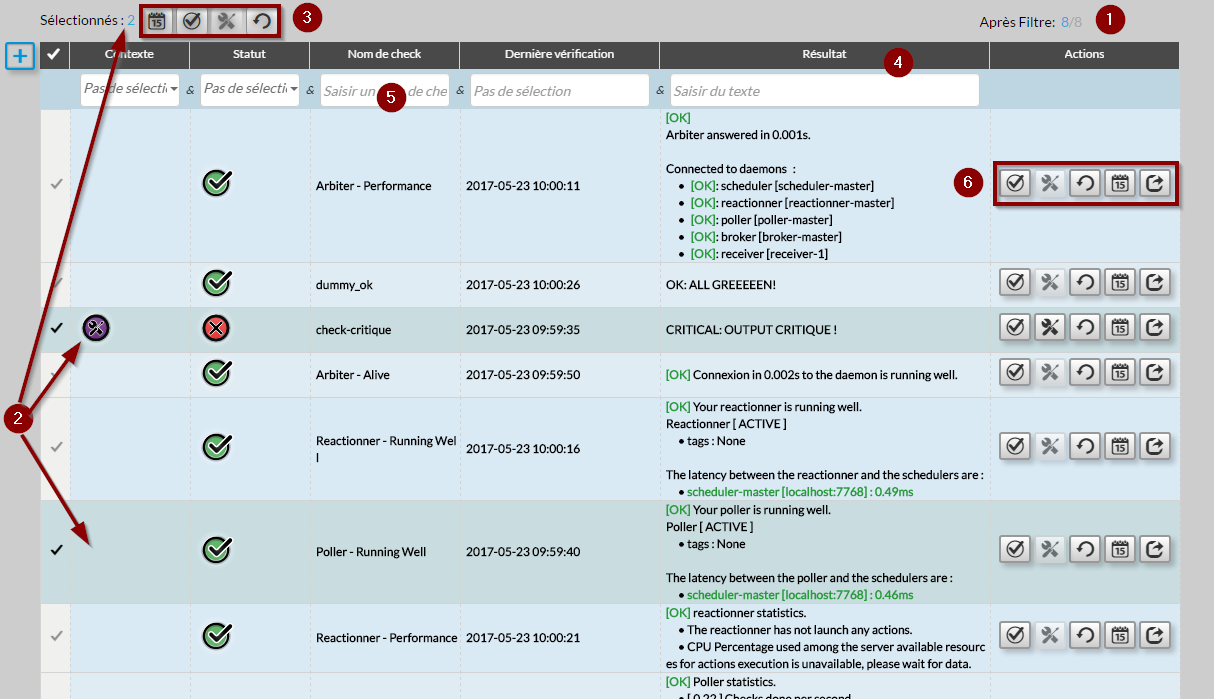 | Remarque: Il y a les 4 mêmes boutons d'action déjà disponibles en entête, plus un cinquième bouton qui permet d'effectuer plusieurs actions. Les actions supplémentaires possibles sont l'ouverture d'un check dans l'onglet graphes ou dans l'onglet historique et l'ouverture d'une url externe associé au check. |