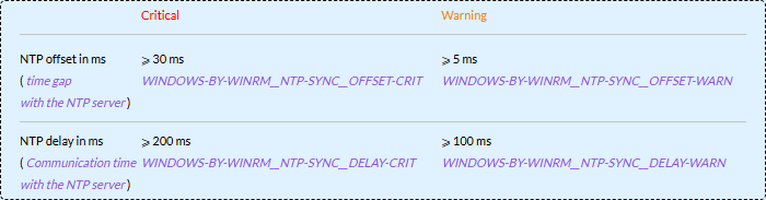 | offset | ms | Décalage de temps entre le système et le serveur | WINDOWS-BY-WINRM__NTP-SYNC__OFFSET-WARN | WINDOWS-BY-WINRM__NTP-SYNC__OFFSET-CRIT |