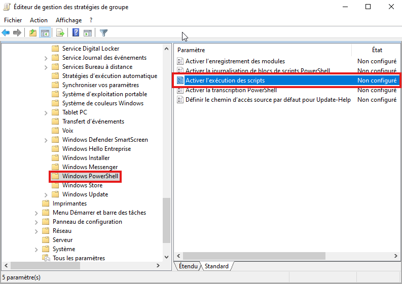 • Dans l'arborescence : "Configuration ordinateur" > "Stratégies" > "Modèle d'administration : définition de stratégies" > "Composants Windows" > "Windows Powershell"