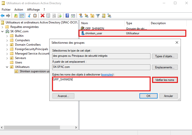 • Vérifier que le groupe shinken ajouté ( GRP_SHINKEN )a bien un SID correspondant ( ici S-1-5-21-3267... ).