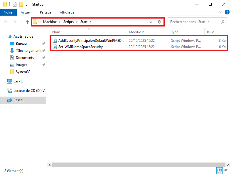 • Répéter l'opération avec le 2ᵉ script : "Set-WMINameSpaceSecurity.ps1", dans le dossier présélectionné ( ... > Machine > Scripts > Startup )