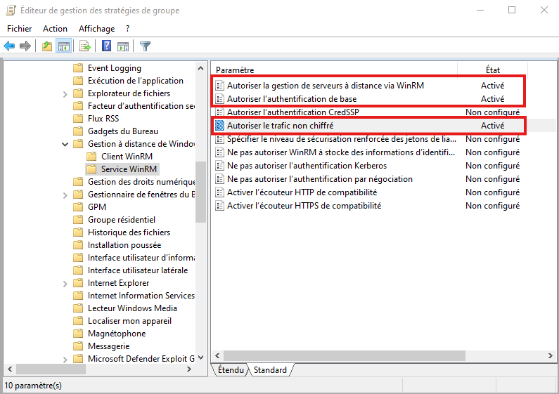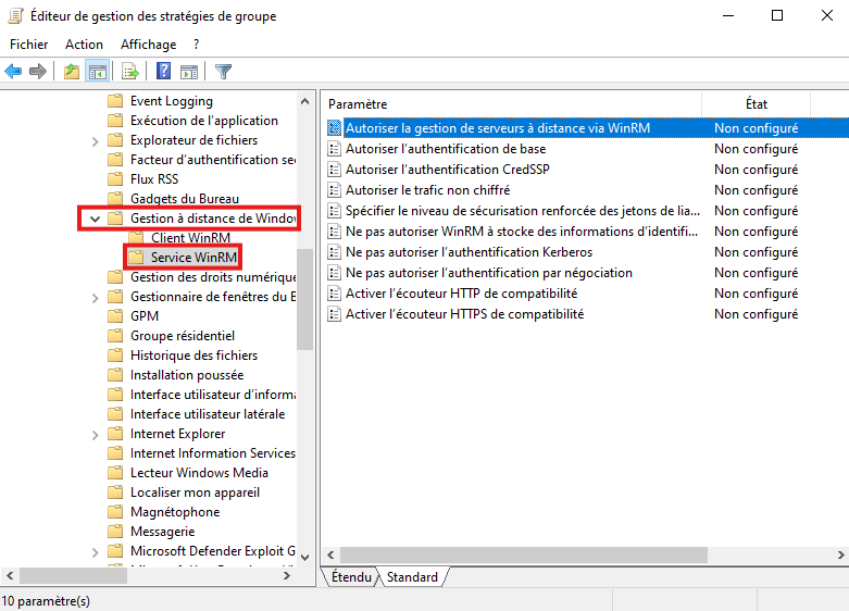• Dans l'arborescence : "Configuration ordinateur" > "Stratégies" > "Modèle d'administration : définition de stratégies" > "Composants Windows" > "Gestion à distance Windows (WinRM)" > "Service WinRM"