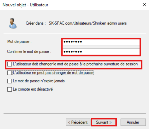 • Décocher "L'utilisateur doit changer le mot de passe à la prochaine ouverture de session"