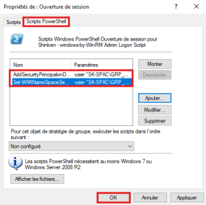 • Cliquer sur parcourir et ajouter le 1er script : "AddSecurityPrincipalonDefaultWinRMSDDL.ps1", dans le dossier présélectionné ( ... > Machine > Scripts > Startup )