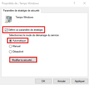 • Dans l'arborescence : "Configuration ordinateur" > "Stratégies" > "Paramètres Windows" > "Paramètres de sécurité" > "Services système" > "Temps Windows"