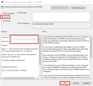 • Attention il est impératif de remplir ces zones de "Filtres IP". Sans cela le service WinRM n'écoutera sur AUCUNE interface réseau et ne RÉPONDERA PAS.